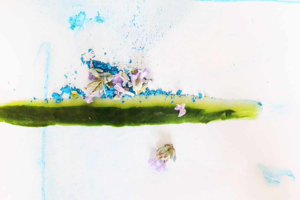 Ce qui reste est l’intitulé d’une autre série et il est particulièrement adéquat. Un photographe, Thierry Cardon, l’explicite en connaissance d’expérience en synthétisant ce que Rieja van Aart apporte à l’art photographique : « La photographie, on le sait, a partie liée avec la disparition : elle montre toujours ce qui n’est plus. Rieja van Aart se saisit de ces indices d’absence propres au medium comme d’une ouverture, pour en déployer la capacité de transformation, en se focalisant sur ce qui reste après la disparition, ce qui est donc en devenir. Elle invite ainsi l’hors-champ – le déjà plus là – dans l’orbite de l’œuvre. » D’où une tension « vers le pas encore ». Du ce qui fut et n’est plus, à ce qui sera : on a là une formule de toute métamorphose. Qu’une photographe maquette un monde pour y faire passer le regard comme un éclairage sur l’inconnu, voilà qui donne aussi la mesure sans mesure connue de ce qui est dévoilé. Dévoilé par saisie. Autrement dit : la gestation captée au passage, à même le passage. Ainsi, dans Ce qui reste 1, des germes étirés au bord de lamelles comme de seiche font germination de lumière, d’éclats froids en plein espace bleu uni, tandis que les grains qu’on devine bordent des lames. C’est ce qui reste de ce qui passe, mais qu’est-ce qui est passé et vers quoi ? On ne peut se le dire autrement qu’en le voyant. Cela reste parce que cela fascine, dans le passage pourtant distinct.
