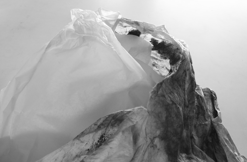 Papier 007c : pris en plongée un ourlet de papier fait bord et lèvres de cratère. Mais c’est encore trop dire, la précision est autre, jamais vue auparavant ni connue, mais désormais là, advenue. Rien qu’avec du papier froissé, éclairé sur fond aussi blanc que lui. Inner Landscape 2406 est aussi une vue en plongée d’une crête de papier froissé bistre, couleur qui dans ses plis brunit, se fronce et fronce au point que l’on « pourrait » y discerner ravins ou flancs de montagne. Et non, le papier ne se laisse pas oublier ; et c’est ainsi que l’artiste a, sciemment, déporter de toute réalité déjà donnée vers une réalité autre, inconnue jusque-là et innommable encore, toujours.