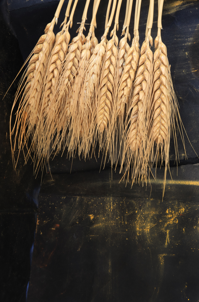 Contemplation 85, œuvre de 2022 : une brassée d’épis de blé bien alignés en parallèle sont suspendus en haut sur une surface à reflets vitrés, si bien qu’une myriade de points lumineux constellent l’apparent vitrage. Sur le fond modulé de bleu profond, cela donne un objet rituel, pour rituel inconnu. Par là, Rieja van Aart est allée plus loin qu’avec les variations chamaniques et apparitions totémiques des années antérieurses.